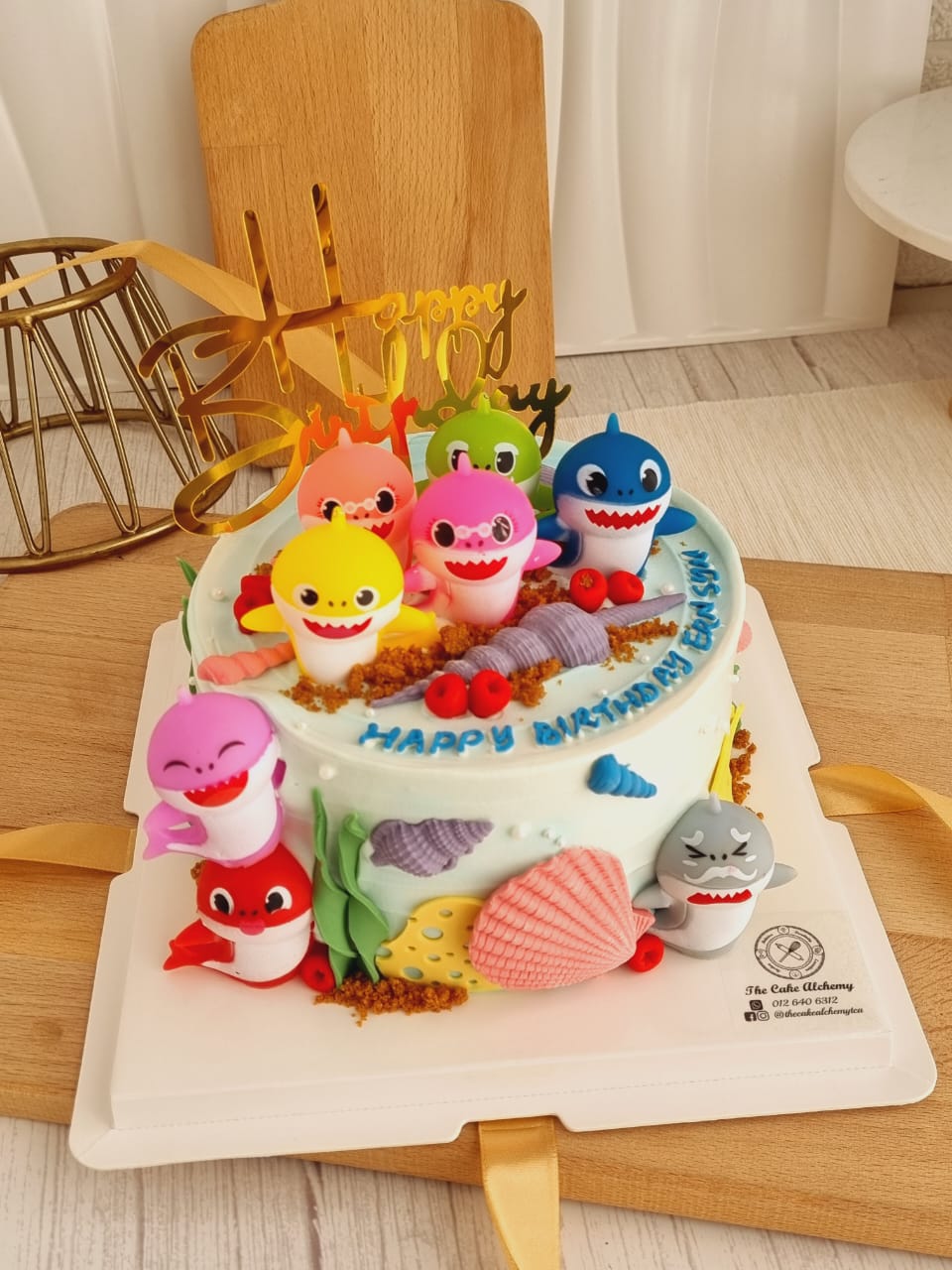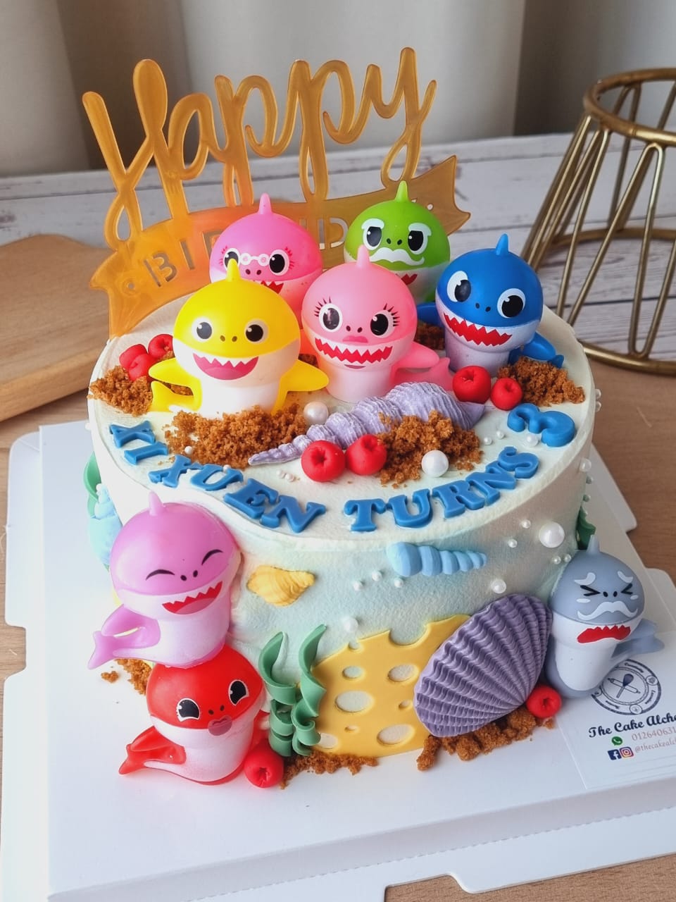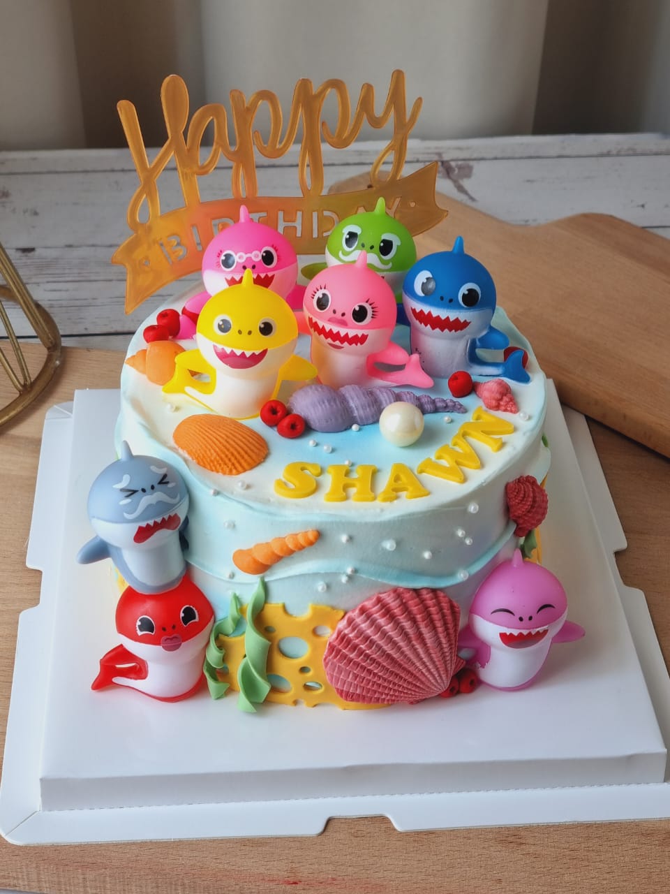 Featuring playful ocean-inspired elements such as seashells, coral details, and soft textures, the cake creates a cheerful underwater theme. A personalized name on the cake adds a special touch, making it a memorable centerpiece for your child’s birthday.