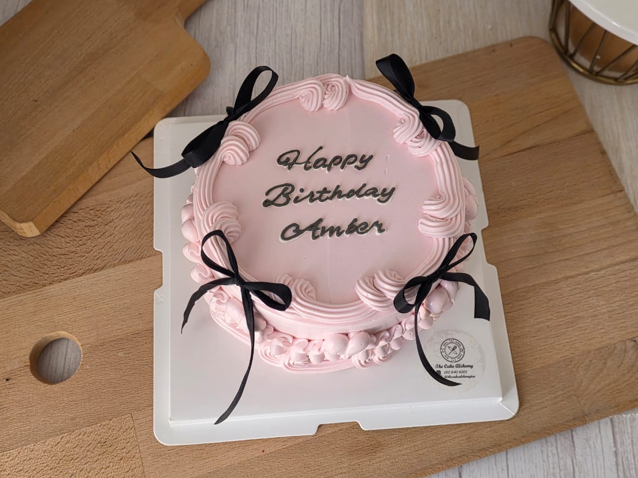 Finished in a delicate blush pink tone, this cake features smooth vintage piping details and dainty black ribbon bows for a charming contrast. The minimalist top surface allows space for personalised birthday wording, making it perfect for intimate celebrations.