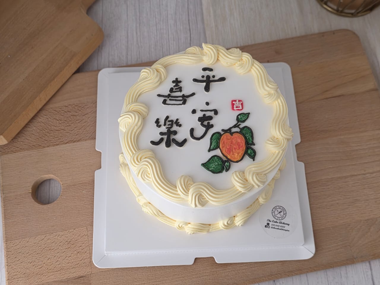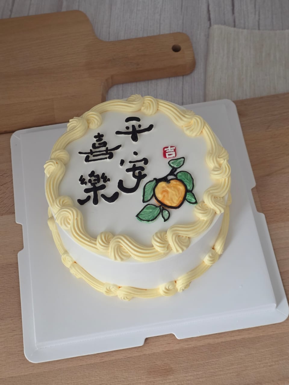 Finished in smooth white fresh cream with classic vintage piping borders, this cake features the auspicious Chinese phrase “吉祥如意” (May all go well with you) and a hand-piped longevity peach symbol — a timeless representation of blessings and good fortune.